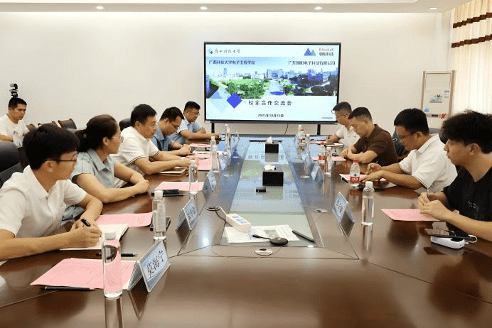 2025年10月16日下午16:00,b体育平台与广西科技大学校企合作座谈会在广西科技大学隆重举行。b体育平台执行副总裁于启胜、研发中心总经理李鑫、人力行政中心总监罗海华,与广西科技大学党委副书记宾月景、学生工作部(处)长朱广生、电子工程学院党委书记梁茜茜、机械与汽车交通工程学院院长孙有平、电子工程学院副院长陈华金、电子工程学院党委副书记兼纪委书记谭趁尤、电子工程学院副院长莫海宁、微电子与先进材料产业学院办公室主任兼电子工程学院实习实训中心主任梁程华等校企双方代表出席,共同探讨人才培养、科研合作、学生实习就业等议题,揭牌“共建产学研合作基地”,推动校企合作向纵深发展。